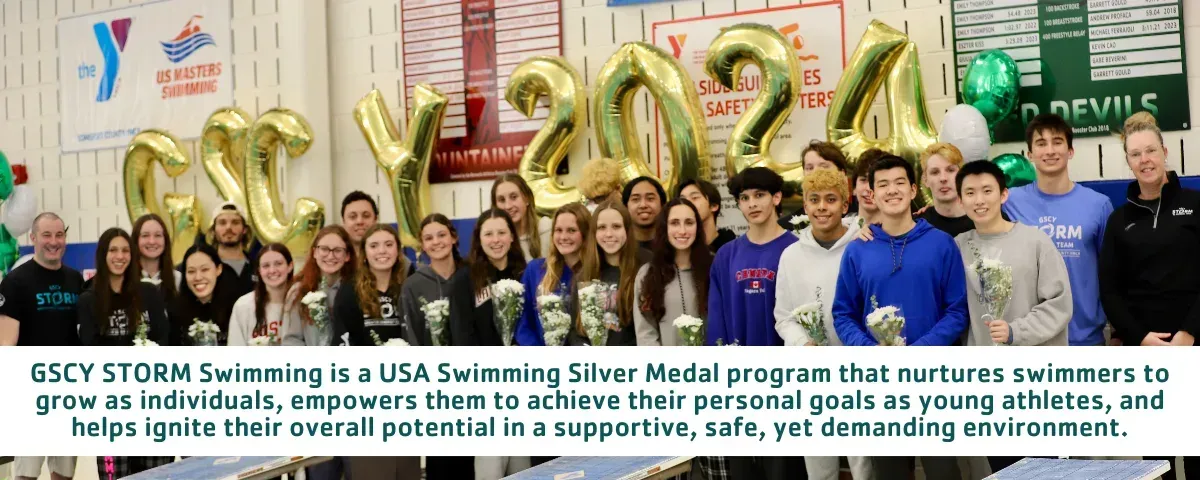 Swimmers' ages range from 7-18 years and the team competes year-round in YMCA and USA-sanctioned meets. Swimmers are placed in practice groups based on age and ability. ASCA and USA Swimming certified professional swim coaches lead GSCY STORM Swimming, backed by our trained, dedicated coaching staff who work all of our young athletes to help improve their skillset in the water and promote a healthy and active lifestyle.